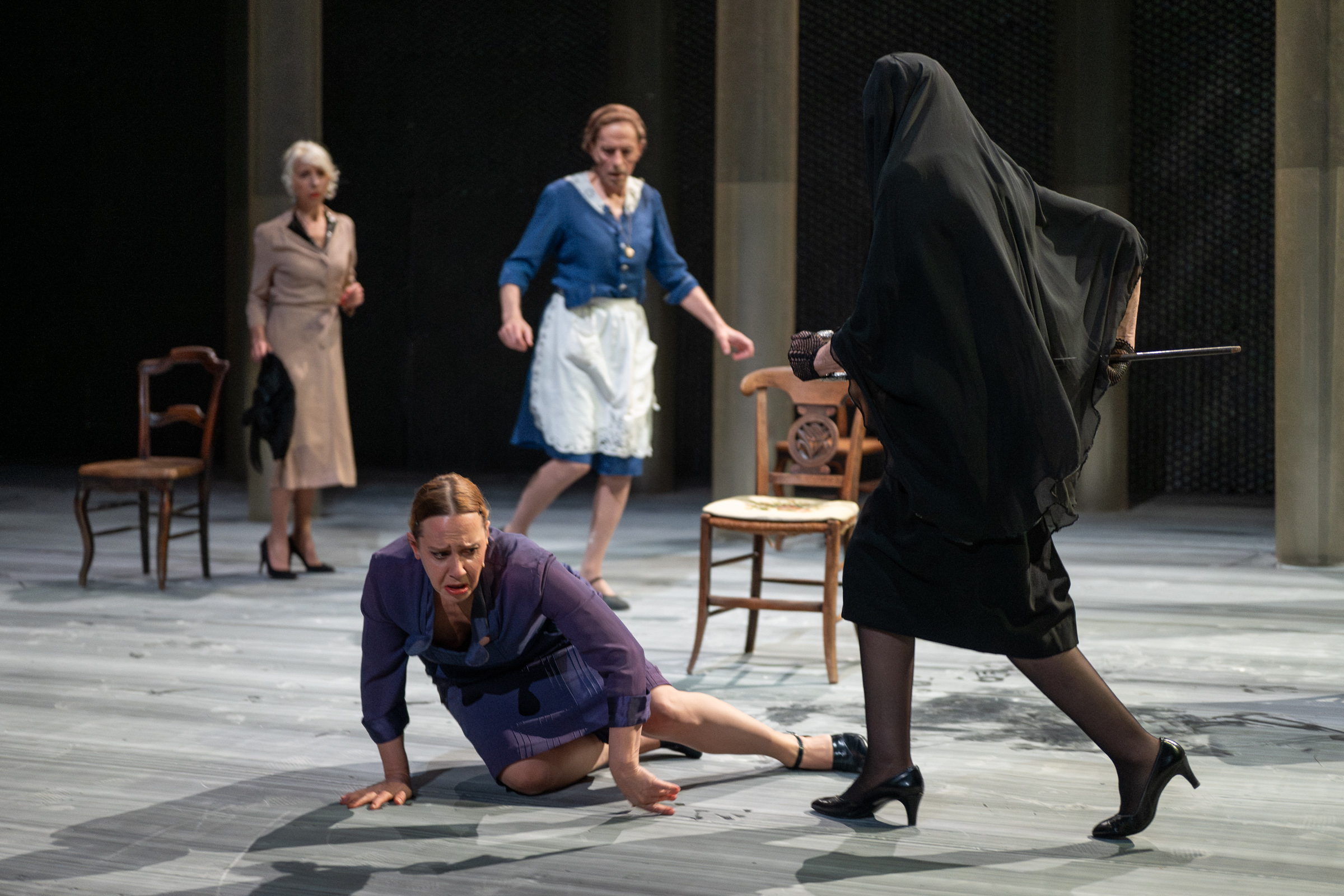 Il faut d'abord voir Charlotte Clamens débarquer sur scène en veuve endeuillée, le visage couvert d'un voile en dentelle noire : une figure brute, de l'obscurité qui bouge. La voilà, Bernarda Alba, ce vieux corbeau tentant de contenir ses cinq filles avec elle dans la cage de malheur qu'est devenue cette maison encore tiède de la présence du père. La matriarche a imposé huit ans de deuil arbitraire sur sa maisonnée alors que ses filles ne rêvent que de prendre l'air, la nuit, dans cet été andalou qui n'en finit pas. Son apparition, canne à la main pour battre son aînée, pauvre Angustias (géniale Michèle Gurtner), annonce déjà beaucoup de cette bataille perdue des corps contre la règle, établissant d'emblée que cette mise en scène jouera sur deux strates en simultané : d'un côté, les transports souterrains, ceux des âmes, en-deçà de la psychologie, et, de l'autre, ce qui se meut en surface – un ballet de corps crispés, émus ou empêchés, redressés ou bien transis, dont le dessin au plateau, souligné par les costumes d'Angèle Micaux et les lumières de Caty Olive, est une aventure formelle en soi.